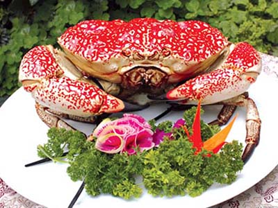 龙虾、皇帝蟹、白牡蛎是澳洲的三宝。其中澳洲出产的巨蟹因为品种肥大,一般可以长到8-10公斤。澳洲巨蟹身躯庞大,相貌丑陋,属于蟹族中的巨无霸,一只大蟹所有的爪子张开得有一张书桌那么大,一个成年人吃起来也很吃力。据说,他们是吃龙虾长大的。巨蟹每磅要价24澳元,一只差不多要2000多元人民币。
